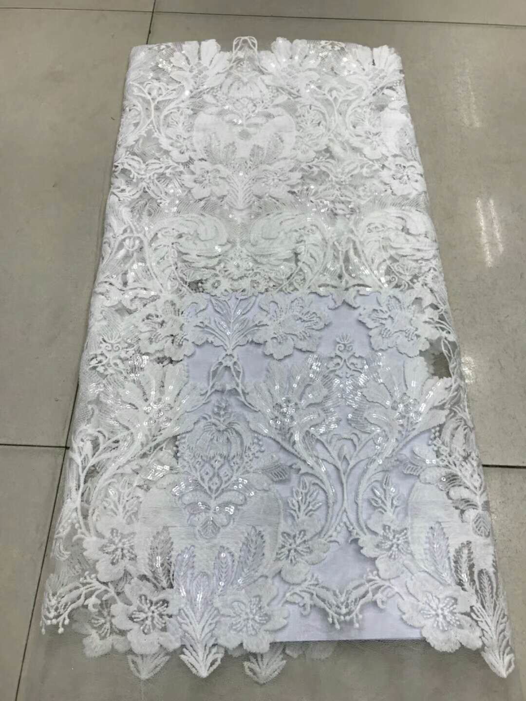 बीडेड लेस फैब्रिक सभी प्रकार के मोतियों और चमकदार टुकड़े को एक साथ लाइन के साथ जोड़ना है। शानदार और शानदार प्रभाव दिखाने में आसान, पोशाक और मंच उपकरण आमतौर पर इस्तेमाल की जाने वाली सजावटी तकनीकें हैं। बीडेड लेस फैब्रिक रासायनिक सामग्री, कांच के उत्पादों, धातु उत्पादों और अन्य सामग्रियों का उपयोग करके बनाया गया है, जो लंबे, छोटे, चौकोर, गोल, किनारे, विभिन्न आकार के कणों से बना है। कपड़ों के विषय के अनुसार, एक सुंदर पैटर्न डिज़ाइन करें, पोशाक में पेंच के चतुर संयोजन के माध्यम से, विभिन्न आकारों और चमकदार चमक वाले रंग की सामग्री के साथ, सजावटी प्रभाव को दर्शाने के लिए।