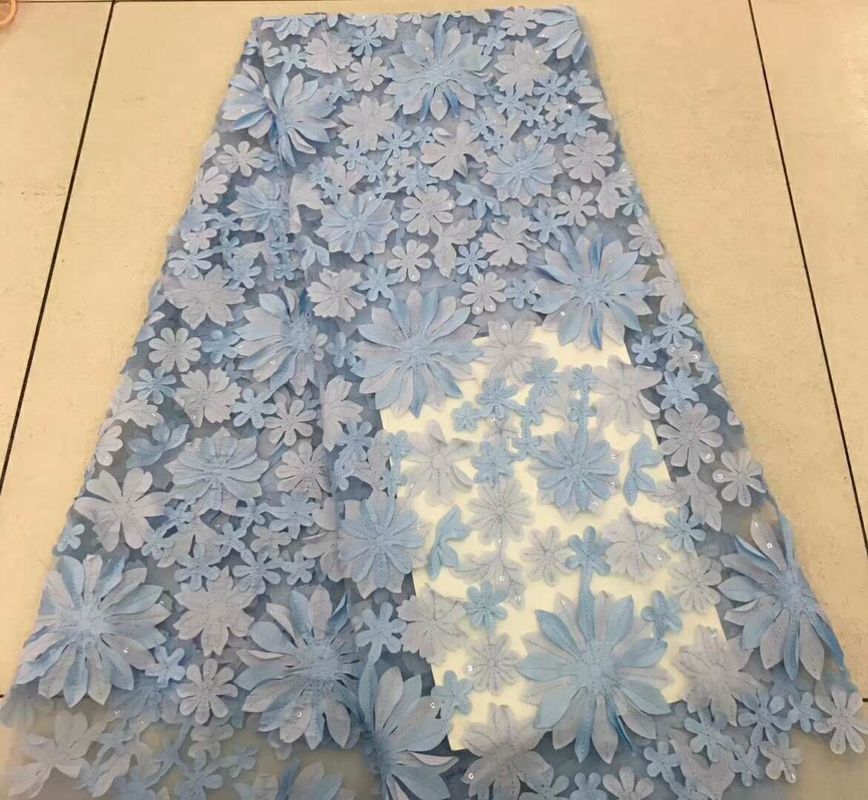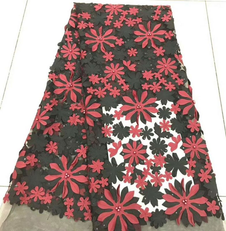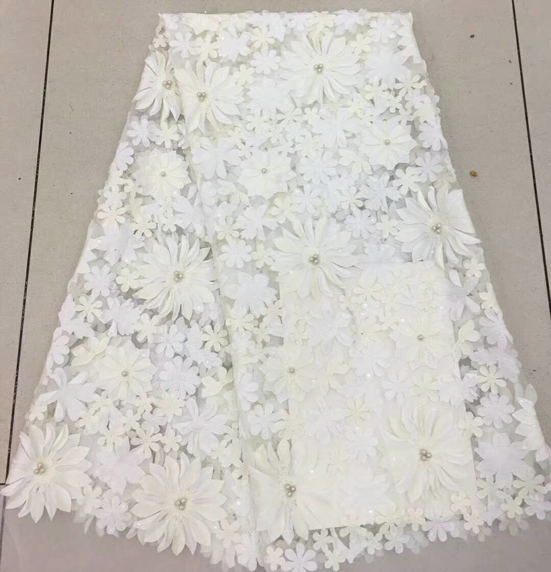 कढ़ाई जाली फीता कपड़े फूलों, मोती और पैचिन के साथ, कढ़ाई सॉफ्टवेयर के साथ डिजिटाइज किए गए पैटर्न का उपयोग करके एक कम्प्यूटरीकृत कढ़ाई मशीन के साथ सिलाई की जाती है।विभिन्न प्रकार के "भरने" तैयार काम के लिए बनावट और डिजाइन जोड़ते हैं. हाथ से बने दाढ़ी के कपड़े पर सिले हुए मोती और पंखुड़ी। 3 डी फूलों के दाढ़ी के कपड़े कपड़ों के सामानों की सजावट, परिधान, पोशाक, स्कर्ट, बच्चों के कपड़े आदि के लिए उपयुक्त हैं।3 डी फूल फीता कपड़े डिजाइन मुख्य रूप से फूलों और पत्तियों पैटर्न, नाजुक और सुरुचिपूर्ण था, जो कि महिलाओं के बीच बहुत लोकप्रिय था।